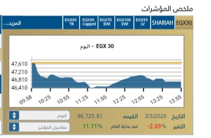وشهد المؤشر الرئيسي EGX30 تراجعًا بنسبة 2,03-% ليغلق عند مستوى 46,725,81نقطة، وسط تدولات قيمتها 6,4 مليار جنيه .