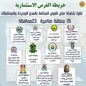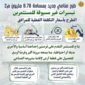 – مساحات القطع المطروحة تتراوح بين 118 متر مربع و400 ألف متر مربع في بعض المناطق الصناعية لتلبية احتياجات مختلف أحجام المشروعات