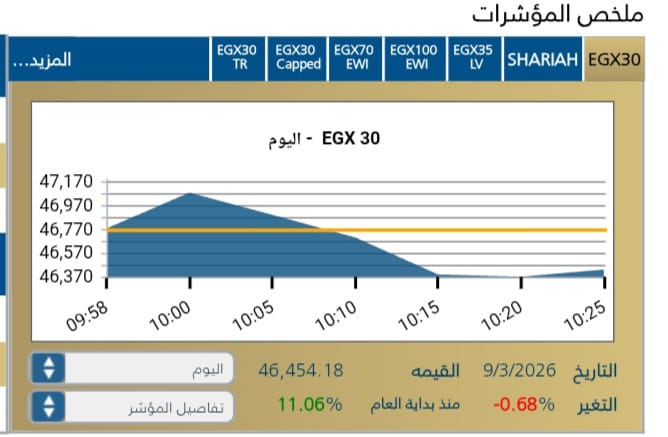 حيث سجل المؤشر الرئيسى EGX30 هبوط ملحوظ مع بداية الجلسه يمثل 46,774,24نقطه .