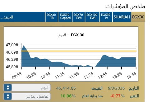 شهد المؤشر الرئيسي EGX30 تراجعًا بنسبة 0,77-% ليغلق عند مستوى 46,414,85 نقطة، وسط تدولات قيمتها 8,9 مليار جنيه .