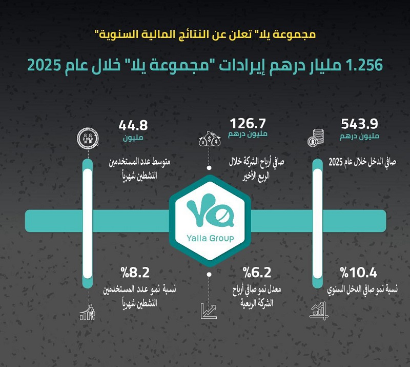 أعلنت “مجموعة يلا” المحدودة، التي تتخذ من الإمارات العربية المتحدة مقراً لها ومالكة أكبر منصة تواصل اجتماعي وألعاب في الشرق الأوسط وشمال إفريقيا عن نتائجها المالية غير المدققة للعام المالي المنتهي 31 ديسمبر 2025 بالإضافة إلى النتائج المالية للربع الأخير من العام نفسه، مؤكدة استمرارها في تحقيق نمو مستقر وتعزيز مكانتها في قطاع الترفيه الرقمي المتنامي في المنطقة.