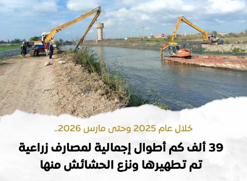 أعلنت وزارة الموارد المائية والري، عن أبرز ما تم إنجازه من خطة الصيانة والتطهيرات للصرف المكشوف والمغطى خلال عام ٢٠٢٥ وحتى مارس ٢٠٢٦، حيث تم ، وتجريف المصارف الزراعية بمكعبات حفر تبلغ حوالي ٨,٥٠ مليون متر مكعب، بالإضافة إلى استكمال عدد ٥١ من الأعمال الصناعية على شبكة المصارف الزراعية، وإحلال وتجديد شبكات الصرف المغطى في زمام حوالي ٦٨ ألف فدان، فضلًا عن تنفيذ أعمال صيانة وغسيل لشبكات الصرف المغطى مرة واحدة على الأقل في زمام يتجاوز ٥,٧٠ مليون فدان .