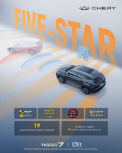 مؤخرًا، نجحت TIGGO7 في حصد أعلى تصنيف للسلامة بخمس نجوم من ثلاث جهات دولية كبرى هي Euro NCAP، وANCAP، وASEAN NCAP. وبانضمام هذا الإنجاز إلى شهادة الخمس نجوم التي حصلت عليها سابقًا من C-NCAP، تصبح TIGGO7 السيارة الوحيدة من علامة صينية التي تنجح في تحقيق أعلى تقييم عبر أنظمة تقييم السلامة الأربعة الرئيسية في العالم.