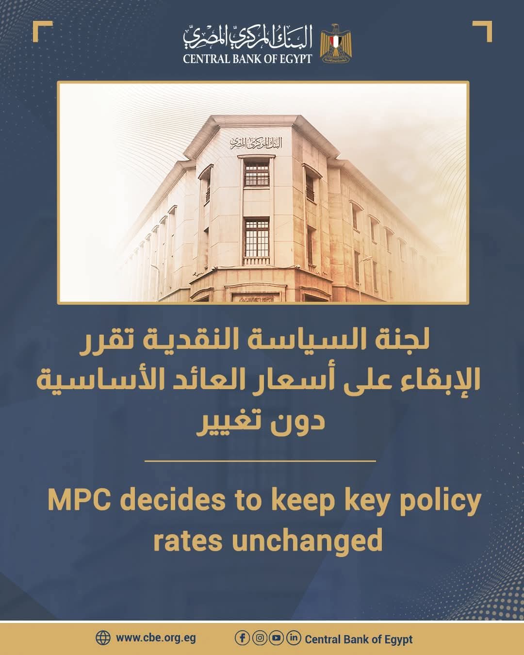قررت لجنة السياسة النقديـة للبنك المركــزي المصـري في اجتماعهـا يــوم الخميس الموافـــق 2 إبريل 2026 الإبقاء على أسعار العائد الأساسية دون تغيير. وعليه، تقرر تثبيت سعري عائد الإيداع والإقراض لليلة واحدة وسعر العملية الرئيسية للبنك المركزي عند 19.00% و20.00% و19.50%، على الترتيب. كما تم الإبقاء على سعر الائتمان والخصم عند 19.50%. ويأتي هذا القرار انعكاسا لرؤية اللجنة لآخر تطورات التضخم وتوقعاته منذ اجتماعها السابقة.