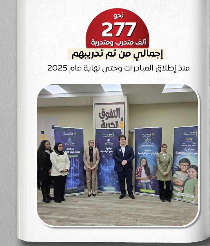 ورواد مصر الرقمية التي أسهمت في تأهيل نحو 24 ألف شاب وشابة من الجامعات والخريجين مع التركيز على العمل الحر والتخصصات الرقمية، وصولًا إلى بناة مصر الرقمية التي وفرت برامج نوعية لـ 167 من المتميزين تجمع بين الدراسة الأكاديمية والتدريب العملي داخل كبرى الشركات، وقد تًرجمت هذه الرؤية إلى نتائج ملموسة، حيث جرى تدريب نحو 277 ألف متدرب ومتدربة حتى نهاية 2025.