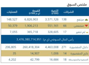 وانتهت تعاملات الشركات في السوق اليوم بارتفاع 138 سهمًا، وانخفاض 66، بينما لم تتغير أسهم 17 شركة.