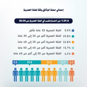 واوضح التقرير أن حسابات الأفراد تستحوذ على نحو 72% من إجمالي الحسابات، يتوزعون بواقع 83% للذكور و17% للإناث، فيما تمثل حسابات المؤسسات نحو 28% من الإجمالي. كما أشار إلى أن الفئة العمرية ” أكبر من 20 إلى 30 عامًا “استحوذت على النسبة الأكبر من حسابات هذا النوع من الاستثمار، بنحو 39.8%.
