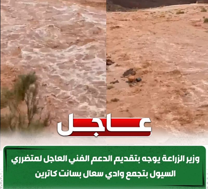 أعلنت الوزارة عن بدء تقديم الدعم الشامل للمتضررين من جراء السيول التي شهدها تجمع “وادي سعال” بمنطقة سانت كاترين، وذلك في إطار جهود الدولة للوقوف بجانب المواطنين في الأزمات وتخفيف الأعباء عن كاهل المزارعين.