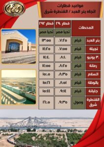 وفي هذا السياق، أعلنت الهيئة القومية لسكك حديد مصر مواعيد تشغيل القطارات على الخط بالعربات المطوّرة “تحيا مصر”، وذلك على النحو التالي: