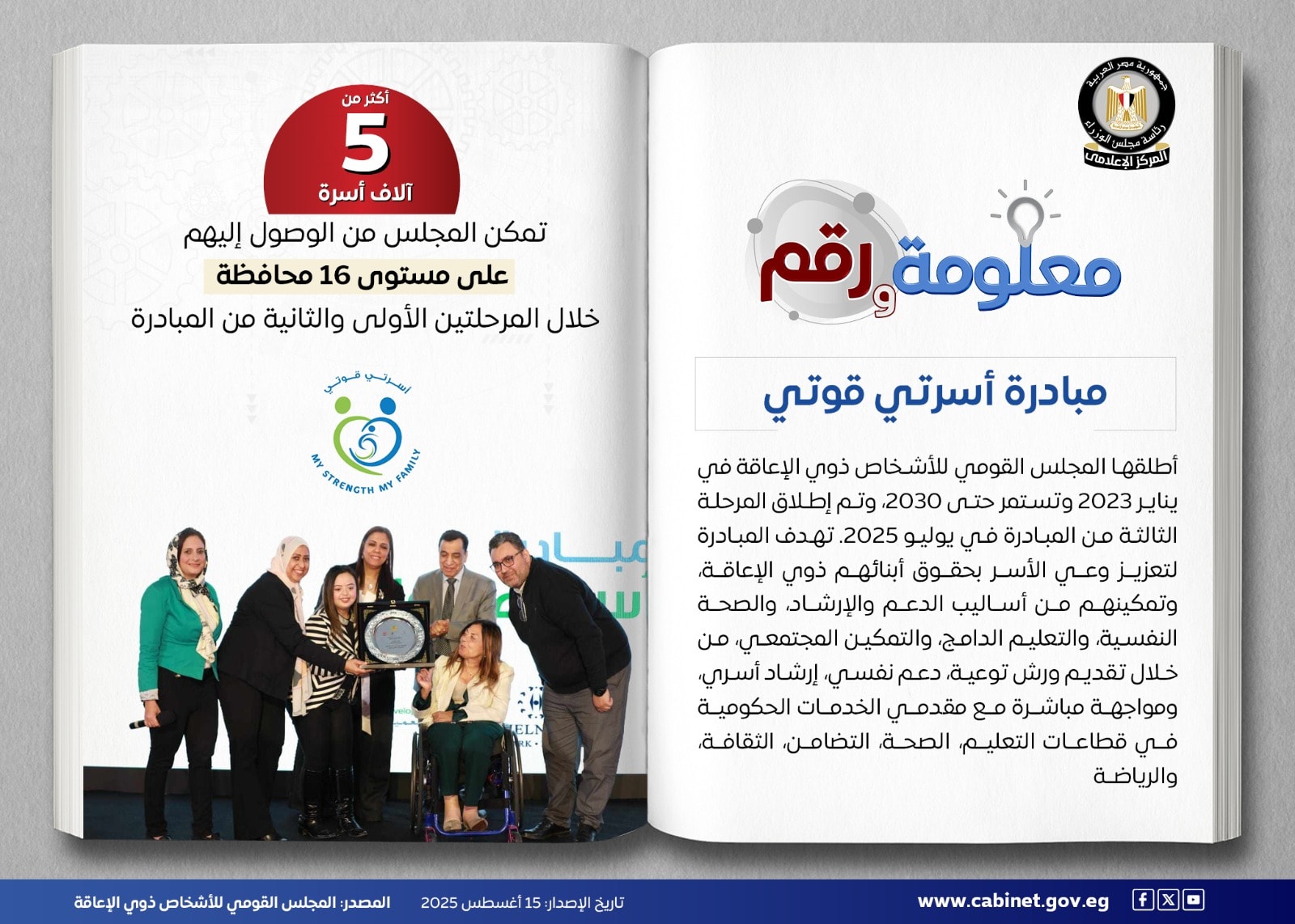 أطلق المجلس القومي للأشخاص ذوي الإعاقة مبادرة “أسرتي قوتي” كنموذج حقيقي للإرشاد والتوعية الأسرية الشاملة بهدف دعم أسر ذوي الإعاقة نفسيًا وتعليميًا ومجتمعيًا، وخلال مرحلتيها الأولى والثانية، وصلت المبادرة إلى أكثر من 5000 أسرة في 16 محافظة، عبر ورش توعية وإرشاد أسري ومواجهة مباشرة مع مقدمي الخدمات الحكومية. وفي يوليو 2025، انطلقت المرحلة الثالثة، مواصلة جهودها لبناء بيئة دامجة يمكن أن تصنع فارقًا حقيقيًا في حياة الأشخاص من ذوي الإعاقة.