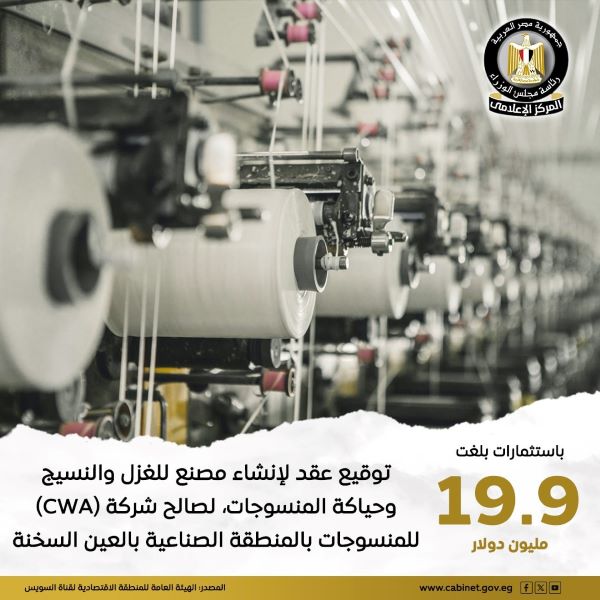 في خطوة مهمة لتعميق الصناعة المحلية داخل المنطقة الاقتصادية لقناة السويس وتعزيز القيمة المضافة للمنتج المصري وزيادة قدرته التنافسية إقليمياً ودولياً ومن ثم زيادة الصادرات وتوفير البدائل المحلية من المنتجات المستوردة ودعم سلاسل الإمداد لصناعات متنوعة مثل الملابس الجاهزة والمفروشات، وتوفير فرص عمل جديدة، تم توقيع عقد مشروع إقامة مصنع للغزل والنسيج وحياكة المنسوجات داخل نطاق المطور الصناعي، شركة التنمية الرئيسية ( MDC) بالمنطقة الصناعية بالعين السخنة.