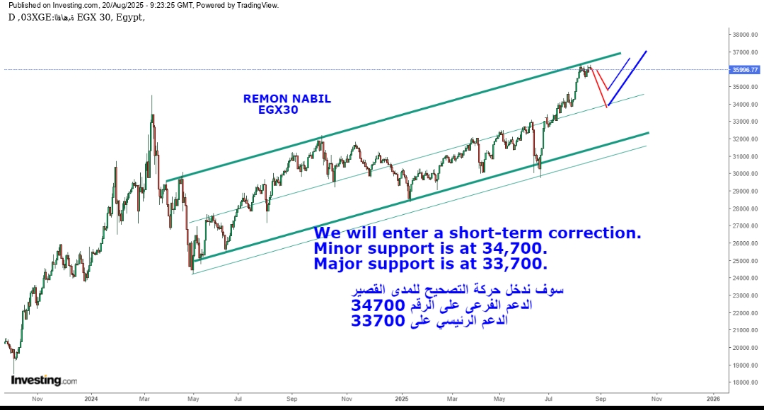 وقال ريمون نبيل، اخير وجهة النظر الفنيه حتى نهايه اغسطس قد نكون على موعد مع تصحيح للمؤشر وقد يكون تلك الأسهم مؤهله بنسب متفاوته للدخول فى تصحيح للمدى القصير حيث تظل الرؤيه على المدى المتوسط ايجابيه فى ظل استمرار التداول اعلى مستوى 32000 نقطه مع الأخذ فى الأعتبار ان مستوى الدعم الفرعى للمؤشر الان عند 34700 نقطه ومستوى الدعم الرئيسي عند مستوى 33700 نقطه والذى من وجهة نظرى قادر على ايقاف اى هبوط حتى منتصف سبتمبر القادم ومعاودة الصعود مره اخرى لتحقيق قمه جديده اعلى من القمه المحققه فى أغسطس الحالى وان ذلك سوف يكون حركه تصحيحيه عاديه داخل اتجاه صاعد و قد يغلب الأداء العرضى على بعض الأسهم فى فرصه لأعاده تدوير السيوله داخل القطاعات من المتوقع ظهور قوه نسبيه فى بعض اسهم القطاع الصناعى و القطاع الزراعى الفتره المقبله بجانب بعض اسهم قطاع البتروكيماويات التى تفوقت على اداء القطاع الشهر الجارى و من المتوقع ايضا استمرار تفوق بعض اسهم القطاع المالى الغير مصرفى حتى نهاية سبتمبر لذلك يجب عدم الأفراط فى استخدام الهامش على الاقل الفتره الحاليه حتى ينتهى التصحيح واتخاذ الفرص الافضل لأقتناصها الفتره المقبله مع رفع مستويات حماية الارباح للمضارب و استمرار سياسة الاحتفاظ للمستثمر طويل و متوسط الأجل و ليظل مستهدف 37000 نقطه قائم للمدى القصير و مستهدف 39000 للمدى المتوسط.