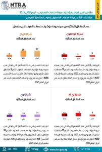 أصدر المركز القومي لمراقبة جودة خدمات الاتصالات التابع للجهاز القومي لتنظيم الاتصالات تقرير نتائج قياسات جودة خدمات الاتصالات، خلال الربع الثاني من عام 2025 (من أبريل إلى يونيو 2025)، والذي تستند منهجية القياس به على اختبار عينات من المكالمات الصوتية وخدمات نقل البيانات للوقوف على جودة خدمات الاتصالات المقدمة من المشغلين في السوق المصري، وذلك باستخدام معدات وسيارات القياس، وبلغت مسافات القياس 162 ألف كم في الطرق الرئيسية والفرعية للمدن والقرى خلال الربع الثاني لعام 2025.