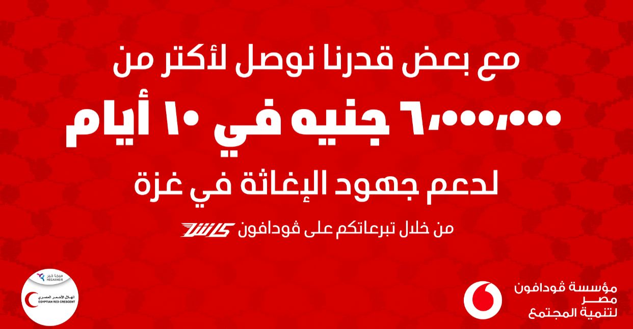 أعلنت ڤودافون مصر اليوم أن إجمالي التبرعات لمبادرتها الإنسانية لدعم غزة قد تجاوز 6 ملايين جنيه خلال 10 أيام فقط، وتم توجيه المبلغ بالكامل عبر جمعية الهلال الأحمر المصري لتقديم الإغاثة العاجلة.
