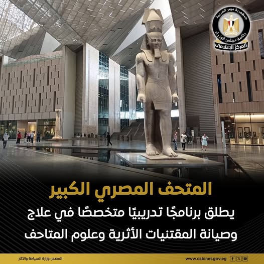 أطلق المتحف المصري الكبير، فعاليات البرنامج التدريبي المتخصص بعنوان: “علاج وصيانة المقتنيات الأثرية وعلوم المتاحف”، والذي يستمر على مدار أربعة أسابيع، بمركز ترميم الآثار بالمتحف ، يأتي ذلك في إطار دوره التثقيفي والتعليمي .