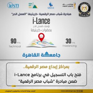 📍أعلن المعهد القومي للاتصالات، عن فتح باب التسجيل في برنامج i-Lance ضمن مبادرة “شباب مصر الرقمية” بمراكز إبداع مصر الرقمية في جامعة القاهرة والفيوم وقنا وبني سويف والوادي الجديد والعريش وأسيوط والمنيا وسوهاج وأسوان.