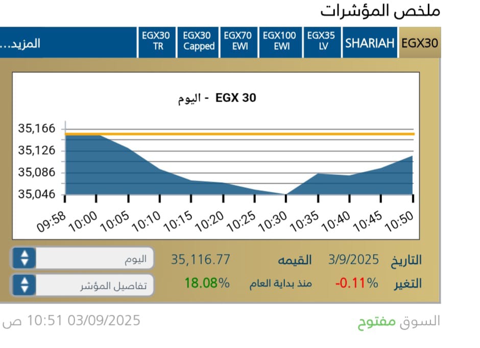 استهلت البورصه المصريه جلسة الأربعاء 3 سبتمبر 2025 تعاملاتها عل وقع ايجابي ملحوظ حيث سجل المؤشر الرئيسى EGX30 ارتفاعا طفيفا مع بداية الجلسه يمثل 35,156,93 .