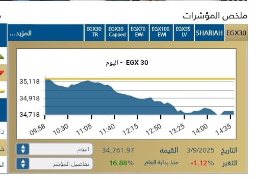سجل المؤشر الرئيسى للبورصه المصريه EGX30 تراجعا بنسبة1,12-% ليغلق عند مستوى 34,761,97 نقطه ، وسط تدولات قيمتها 3,89مليار جنيه .