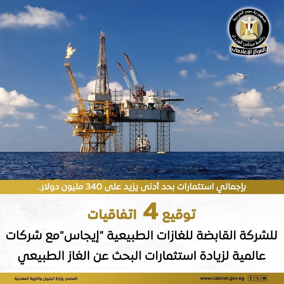استمرارًا لجهود دفع عجلة الاستثمار بقطاع الغاز الطبيعي، وتسريع وتيرة أنشطة البحث والاستكشاف بما يسهم في نمو موارد الغاز وزيادة الإنتاج، تم توقيع 4 اتفاقيات جديدة للشركة المصرية القابضة للغازات الطبيعية “إيجاس” مع عدد من كبرى الشركات العالمية للبحث عن الغاز والبترول في البحر المتوسط والدلتا، بإجمالي استثمارات حدها الأدنى يزيد علي 340 مليون دولار وحفر 10 آبار، وهذه الاتفاقيات هي: