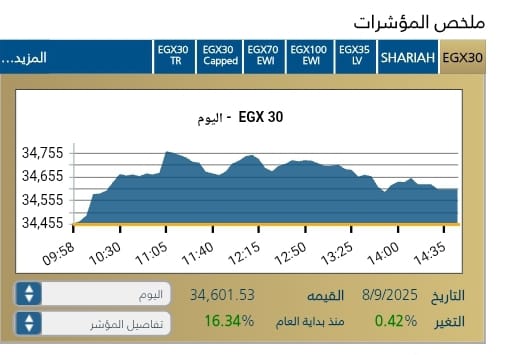 سجل المؤشر الرئيسى للبورصه المصريه EGX30 ارتفاعا بنسبة 0,42% ليغلق عند مستوى 34,601,53 نقطه ، وسط تدولات قيمتها 5,176 مليار جنيه .
