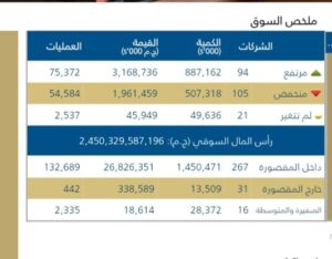 اذا ارتفعت اسهم 94 شركه مع هبوط اسهم 105 شركه وبقاء اسهم 21 شركه مستقره عل مستويات أسعارها بدون تغير.